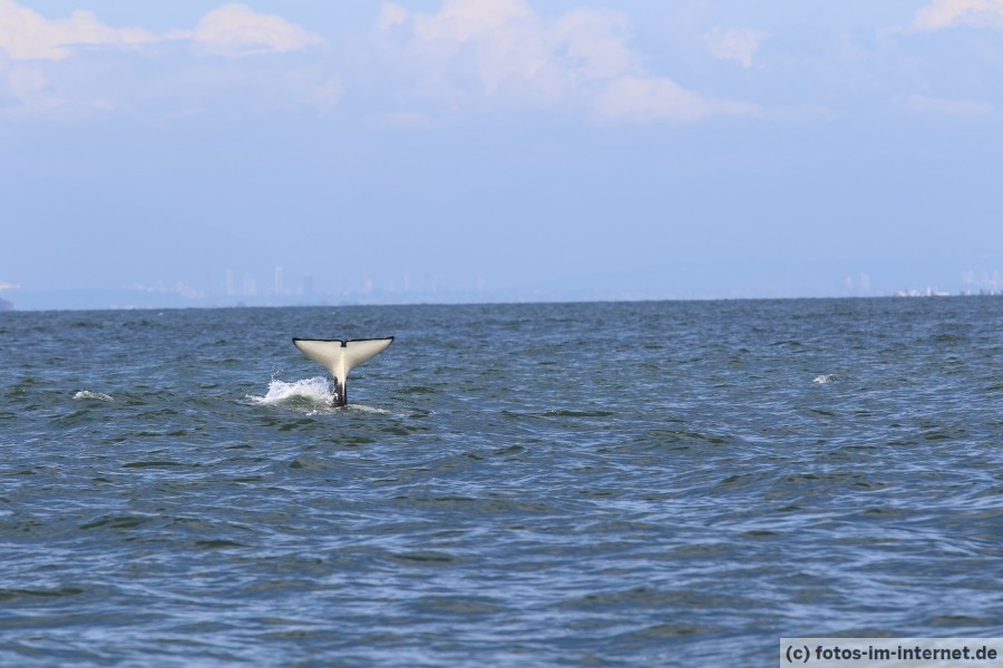 Wir haben schönes Wetter morgens um 10 Uhr auf der Fähre von Vancouver nach Vancouver Island. Die herrliche Aussicht auf das Meer und die umliegenden Berge hat uns schier überwältigt. Wir hatten auch gelesen, dass während der Überfahrt Wale gesichtet werden können. Da hatten wir aber leider auf der Fähre kein Glück. Auf Vancouver Island angekommen, kaufen wir schnell im Supermarkt ein und machen uns sogleich auf den Weg nach Campbell River. Wir fahren die komplette Strecke die Küste entlang und beobachten immer wieder Adler hoch oben in der Luft. Kurz vor dem Ziel Campbell River sehe ich ein paar wenige Leute mit Fotoapparaten am Meer stehen. Spontan halte ich an. Meine Frau steigt aus und sieht nach, warum die Leute hier Bilder machen und wir können unser Glück kaum fassen. Eine Orca Mutter schwimmt mit ihrem Kind keine 5 Meter weg und taucht direkt vor unserer Nase auf. Wir beobachten die beiden Killerwale noch weiter und fahren weiter zum Hotel, als die beiden Wale nicht mehr zu sehen sind.